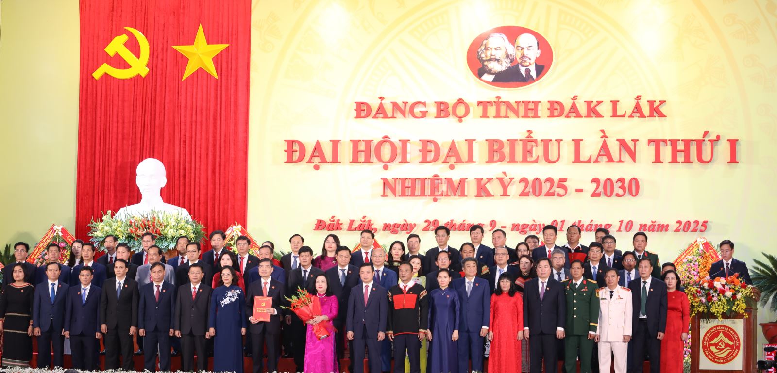 Uỷ viên Bộ chính trị Nguyễn Văn Nên trao quyết định, tặng hoa chúc mừng và chụp hình lưu niệm với Ban Chấp hành Đảng bộ tỉnh Đắk Lắk nhiệm kỳ 2025-2030
