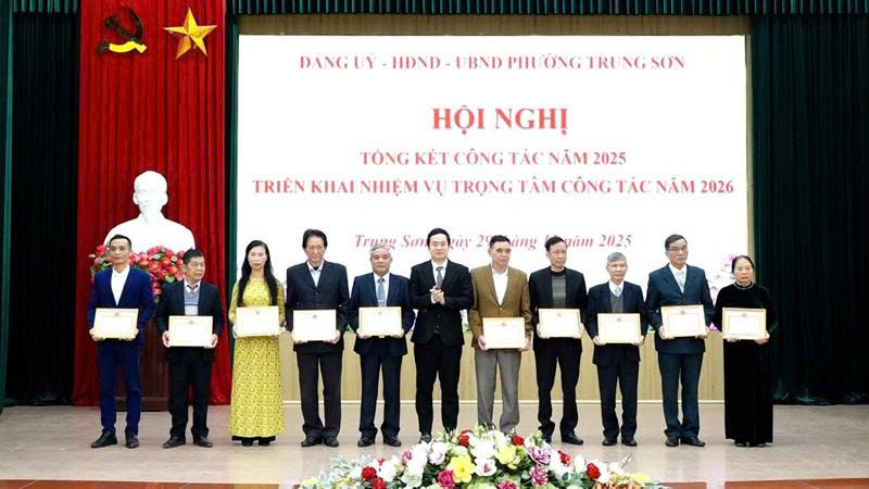 Cũng tại hội nghị, Ban Thường vụ Đảng ủy phường Trung Sơn đã trao Giấy khen cho 82 tập thể, cá nhân đạt tiêu chuẩn hoàn thành xuất sắc nhiệm vụ năm 2025 và UBND phường trao tặng Giấy khen cho 134 tập thể, cá nhân có thành tích xuất sắc trong phong trào thi đua năm 2025.