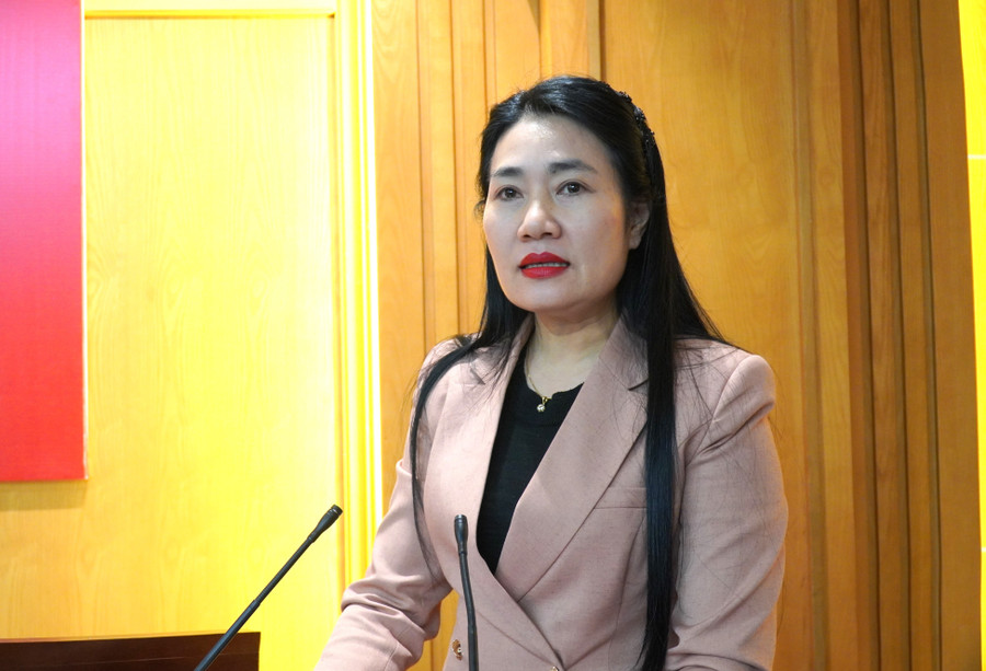 Đồng chí Nguyễn Thị Việt Hà - Phó Chủ tịch HĐND tỉnh Hà Tĩnh báo cáo tại cuộc họp báo