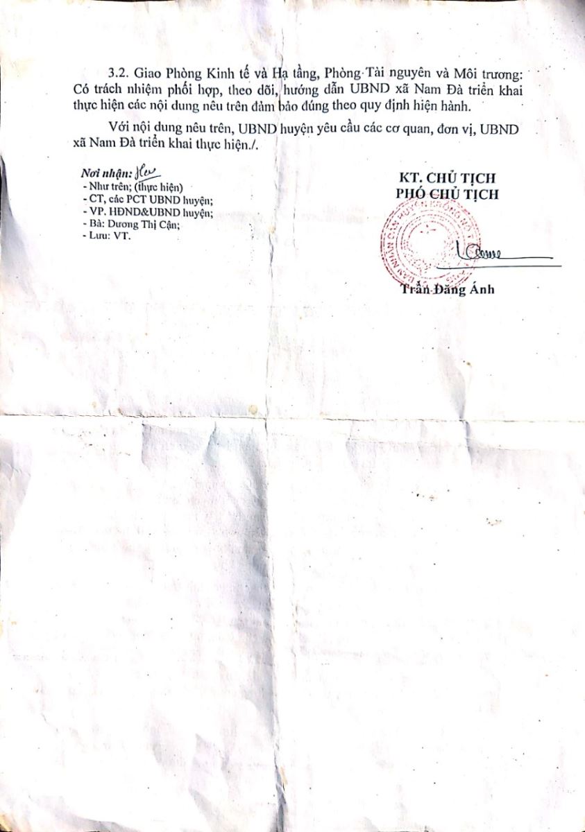 theo đó kiểm tra xử lý các hộ gia đình xung quanh khu vực xả nước sinh hoạt ra mương nước khu vực trục đường 6 gây mất vệ sinh môi trường khu vực, nhưng văn bản ra chỉ có ở trên giấy còn biện pháp xử lý của chính quyền xã năm Đà thì vẫn chưa tìm ra được hướng xử lý mang tính căn cơ, tình trạng ô nhiễm vẫn tái diễn và nhân dân vẫn là người phải gánh chịu ô nhiễm.