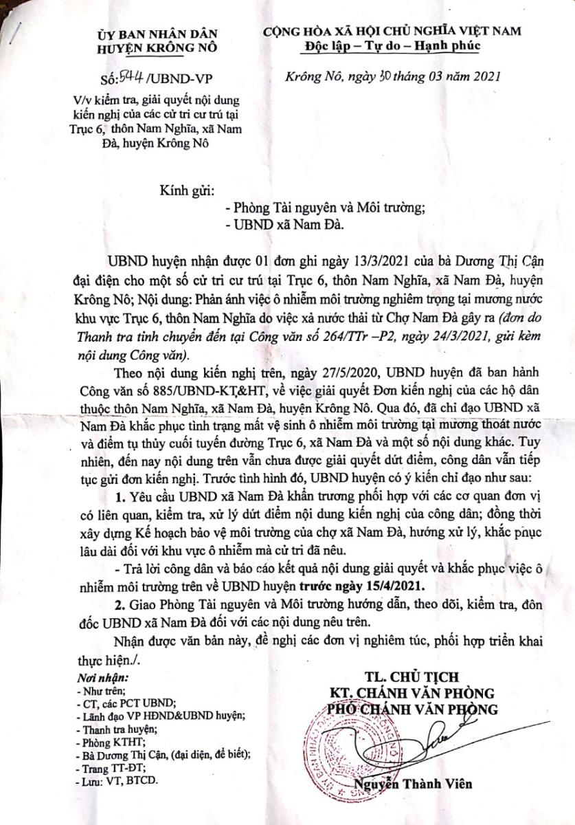 Được biết, ngày 27/05/2020 UBND huyện Krông Nô đã ra văn bản chỉ đạo số 885/UBND-KT&HT giao cho các Phòng ban và yêu cầu xã Nam Đà cân đối nguồn kinh phí để khắc phục tình trạng mất vệ sinh, ô nhiễm môi trường tại mương thoát nước và điểm tụ thủy cuối tuyến đường trục 6, xã Nam Đà, hoàn thành và báo cáo kết quả thực hiện về UBND huyện trước ngày 10/06/2020.