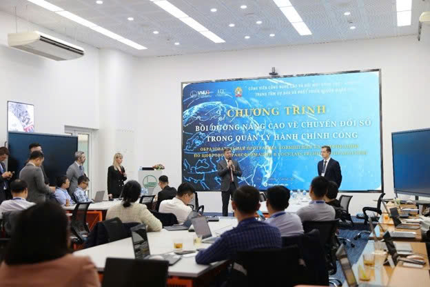 Toàn cảnh lớp học chương trình “Chuyển đổi số trong quản lý hành chính công” do ĐHQGHN phối hợp Học viện Tổng thống Nga – RANEPA tổ chức.( Nguồn: Internet)