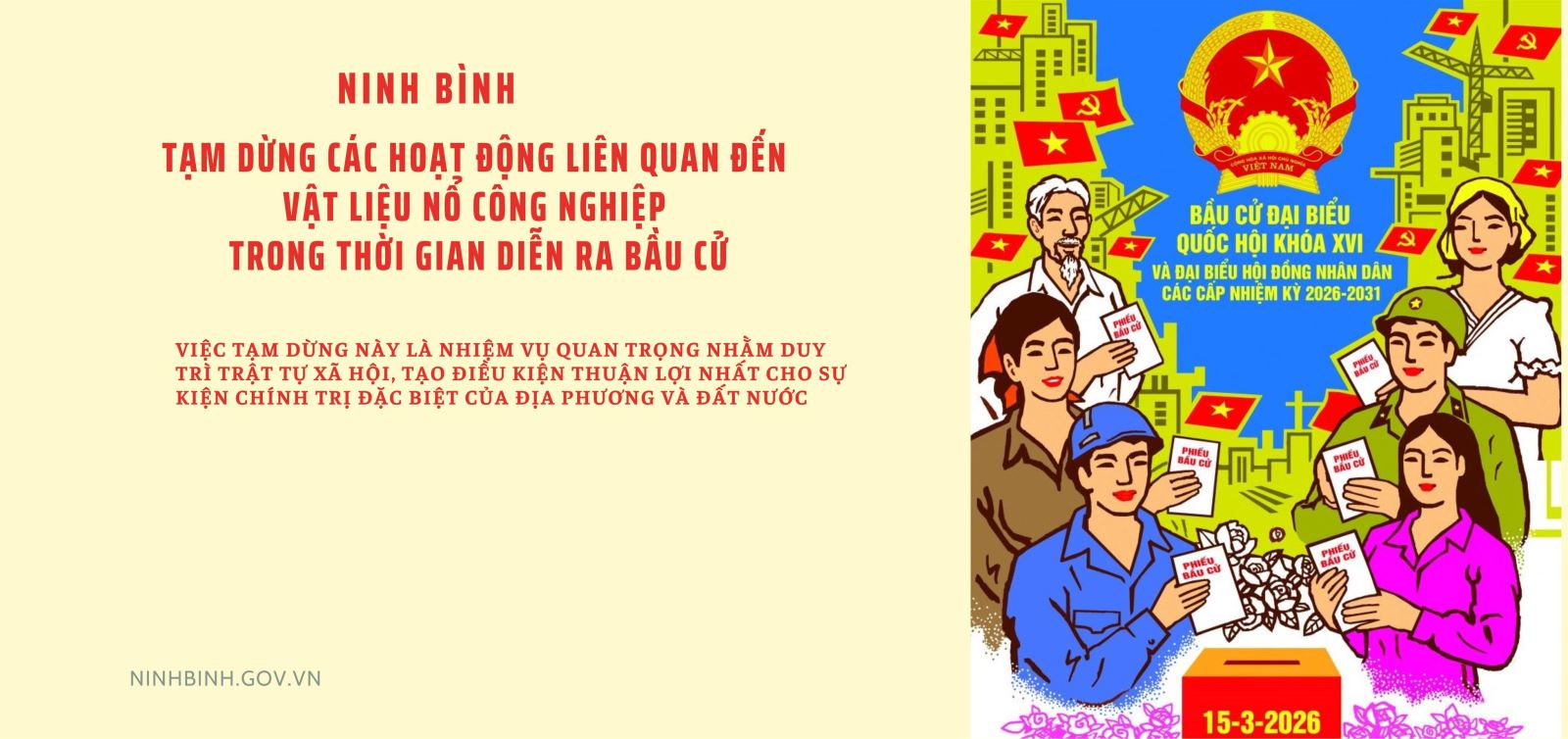 Để bảo đảm tuyệt đối an ninh, an toàn cho cuộc bầu cử đại biểu Quốc hội khóa XVI và đại biểu Hội đồng nhân dân (HĐND) các cấp nhiệm kỳ 2026 – 2031, UBND tỉnh Ninh Bình vừa ban hành Công văn số 1387/UBND-VP4 yêu cầu tạm dừng các hoạt động liên quan đến vật liệu nổ công nghiệp trên địa bàn tỉnh.