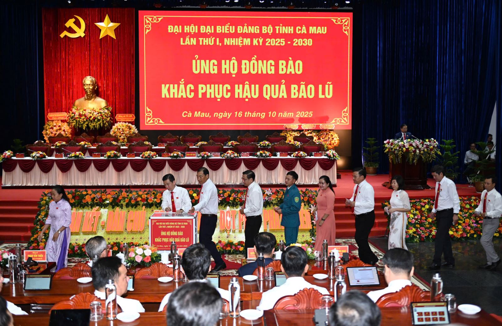 Đại biểu Đảng bộ tỉnh Cà Mau ủng hộ đồng bào bị thiệt hại do thiên tai gây ra. Ảnh BTC