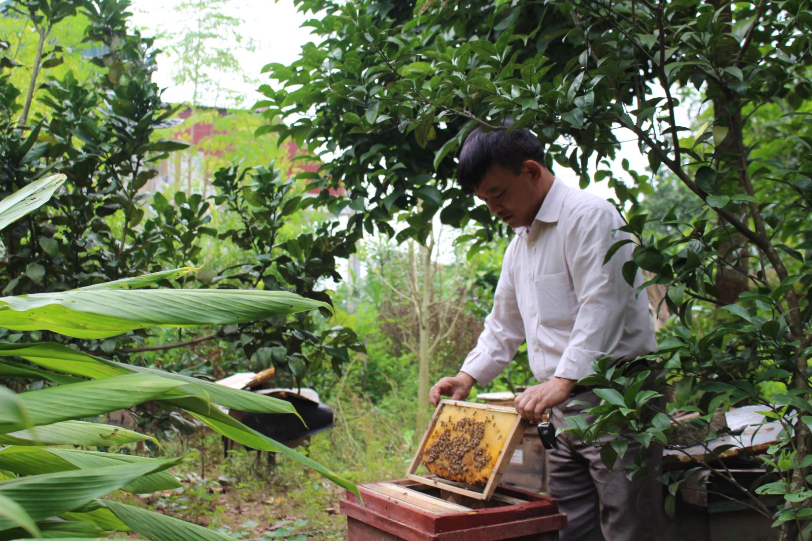 Trong những lúc nhàn rỗi, ông hay ra vườn chăm sóc cây. Chiều chiều nghe tiếng ong rừng vo ve về làm tổ ở trong vườn, ông nghĩ đất nhà rộng, tại sao mình lại không làm vài thùng ong. Từ ý tưởng đó, ông đã mua ong về nuôi...