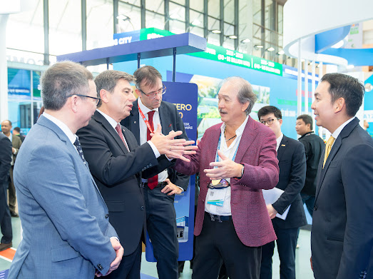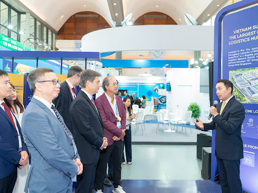 Chủ tịch FIATA Turgut Erkeskin cùng đại diện các hiệp hội, doanh nghiệp... hàng đầu thế giới tham quan gian trưng bày của Việt Nam SuperPort™ tại sự kiện.
