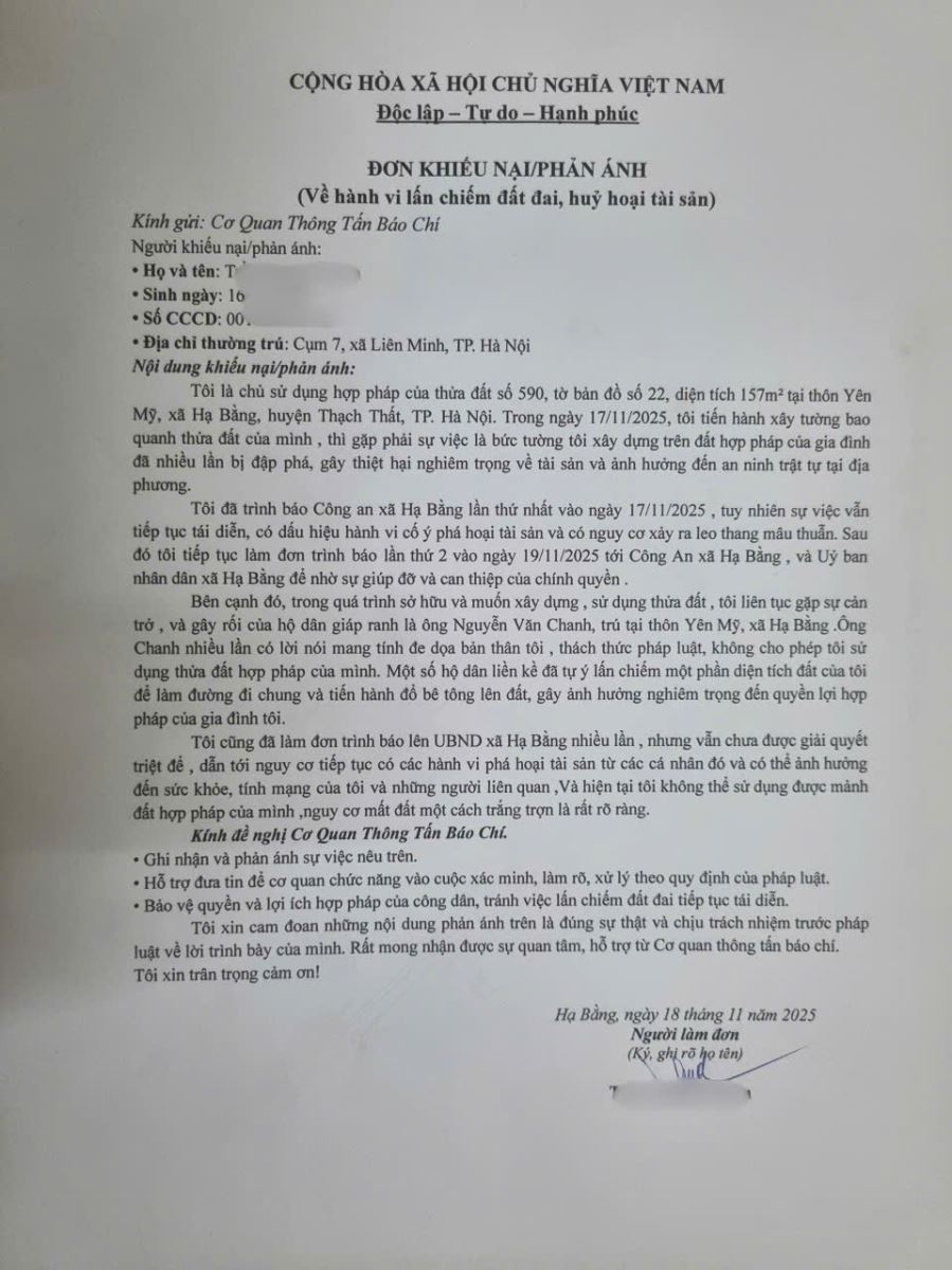 Theo nội dung đơn thư của công dân T.Q.X, ông là người sử dụng hợp pháp thửa đất số 590, tờ bản đồ số 22, diện tích 157 m² tại thôn Yên Mỹ, xã Hạ Bằng. Khi tiến hành xây dựng tường bao từ ngày 17–19/11/2025, gia đình liên tiếp bị người khác cản trở, đập phá công trình, gây gián đoạn thi công và ảnh hưởng đến tài sản.