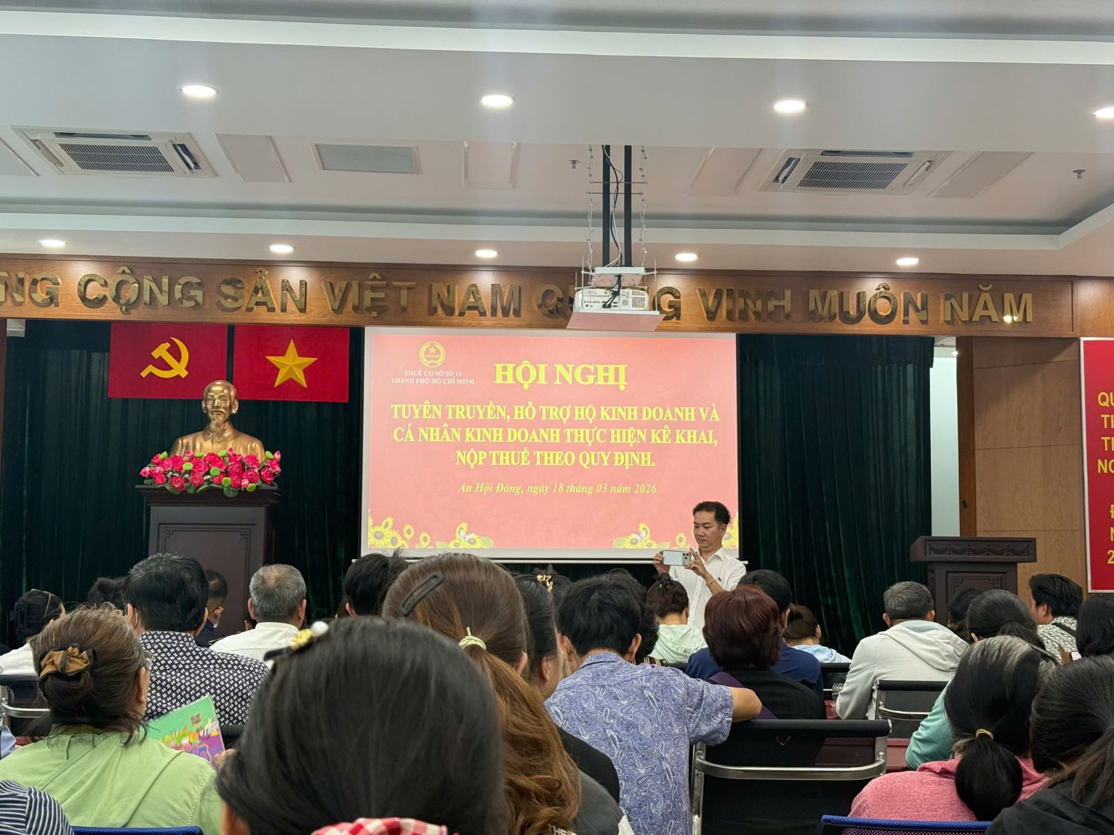 Ngày 18/3, tại phường An Hội Đông – một trong những địa bàn có số lượng hộ kinh doanh lớn – Thuế Cơ sở 15 (thuộc Thuế TP.HCM) đã tổ chức hội nghị tuyên truyền, đối thoại nhằm tháo gỡ khó khăn cho người nộp thuế trong quá trình chuyển đổi. Hiện đơn vị này quản lý nhiều địa bàn như Hạnh Thông, An Nhơn, Gò Vấp, Thông Tây Hội, An Hội Tây và An Hội Đông.