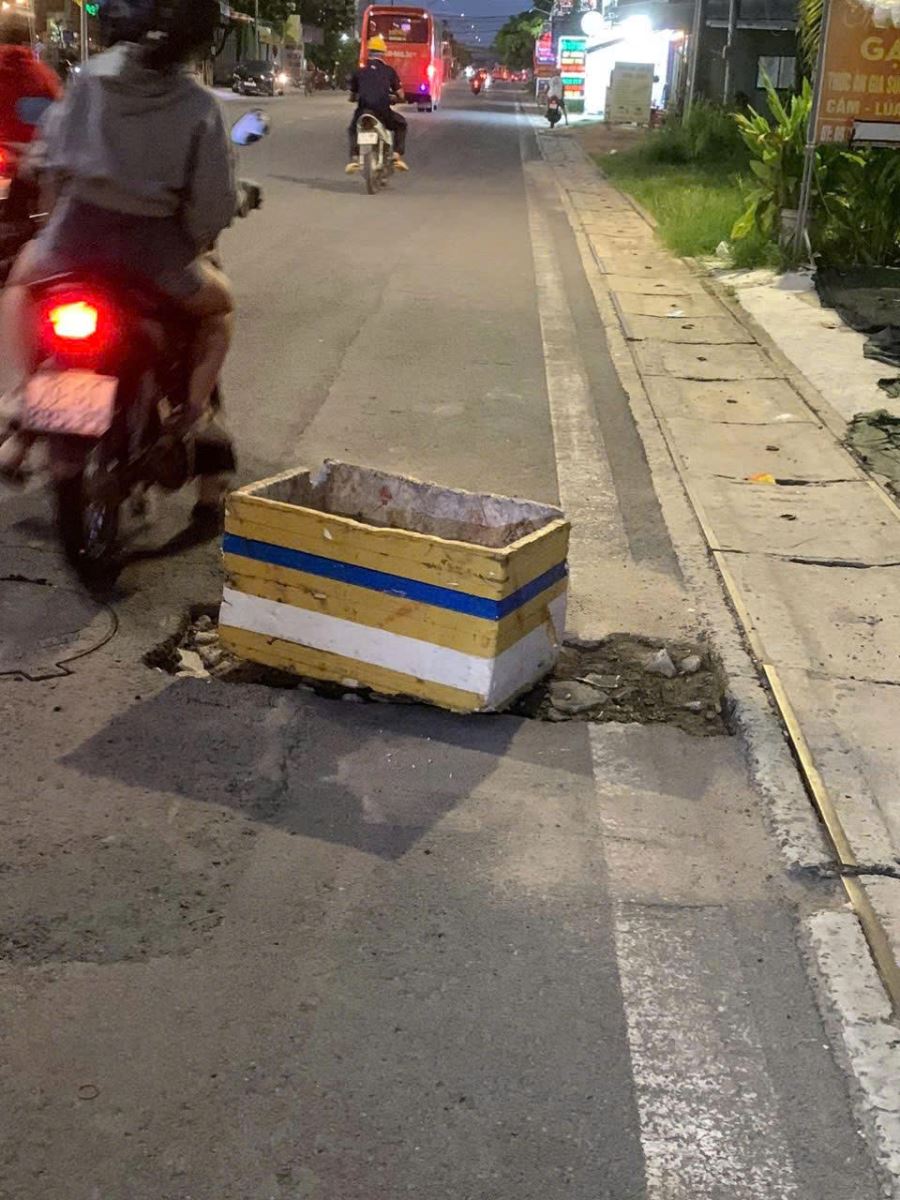 Do lo ngại tai nạn, một số hộ dân đã tự mang đất đá san lấp tạm hoặc đặt các vật cản báo hiệu như: gạch, thùng xốp, cọc tre gắn khăn… để cảnh báo người đi đường.