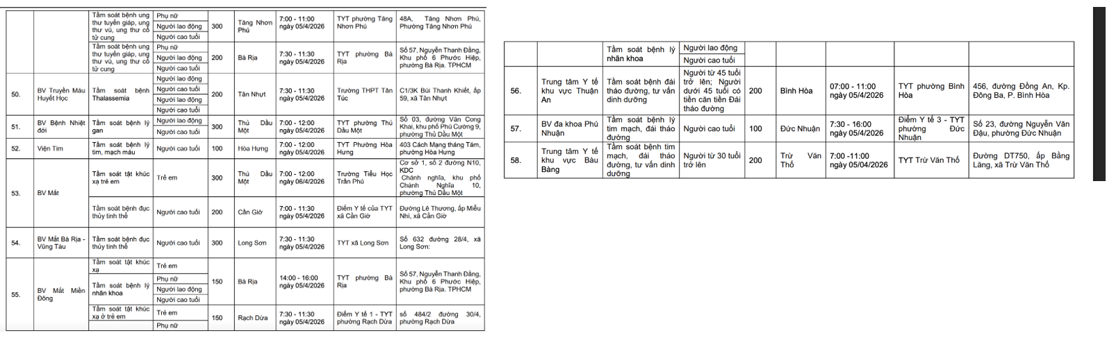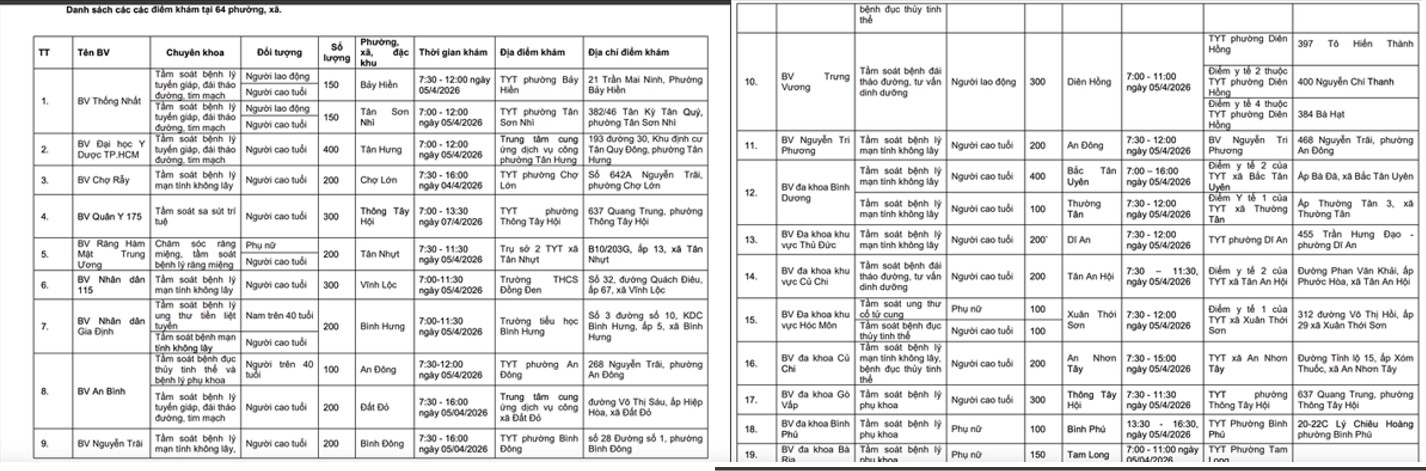 Theo kế hoạch, chương trình được triển khai tại 58–60 điểm khám đặt tại các trạm y tế xã, phường, với sự tham gia của 58 bệnh viện, trung tâm y tế, phủ khắp 64 phường, xã. Dự kiến khoảng 16.000 lượt người dân sẽ được khám và tầm soát miễn phí, ưu tiên người cao tuổi, trẻ em, phụ nữ và các nhóm có nguy cơ.